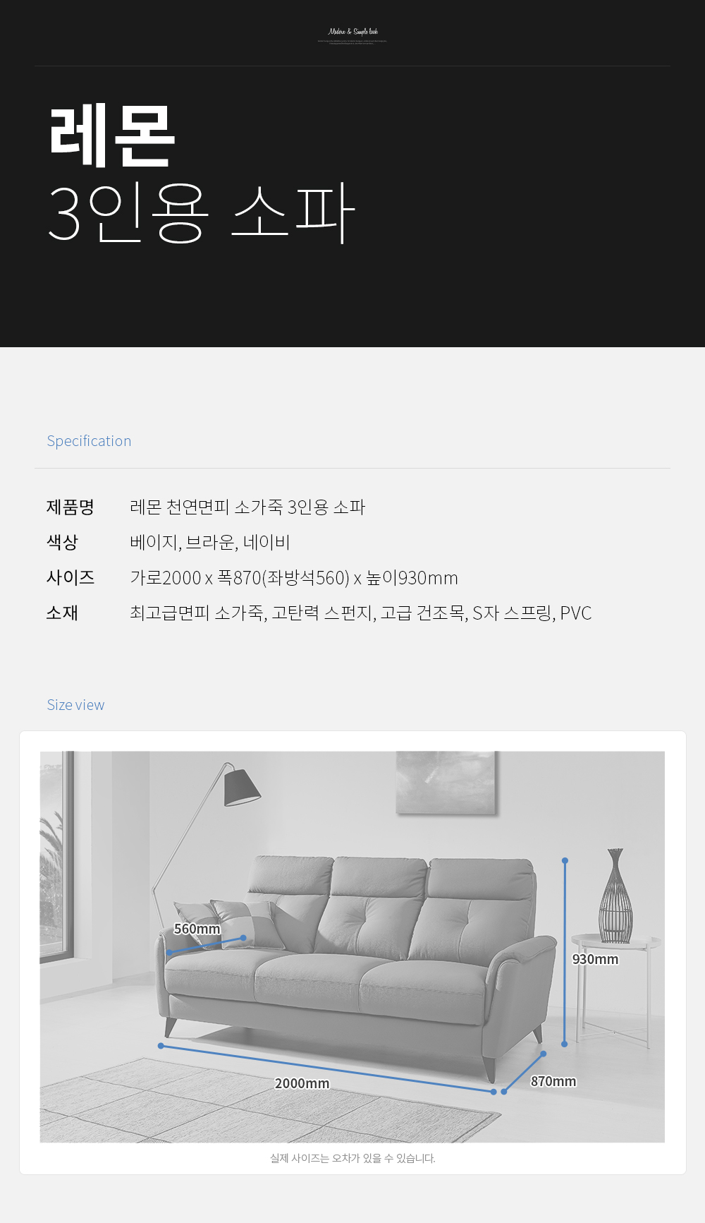 home > 소파 > 2~3인용 > 레몬 천연면피 소가죽 3인용 소파(쿠션1개포함)