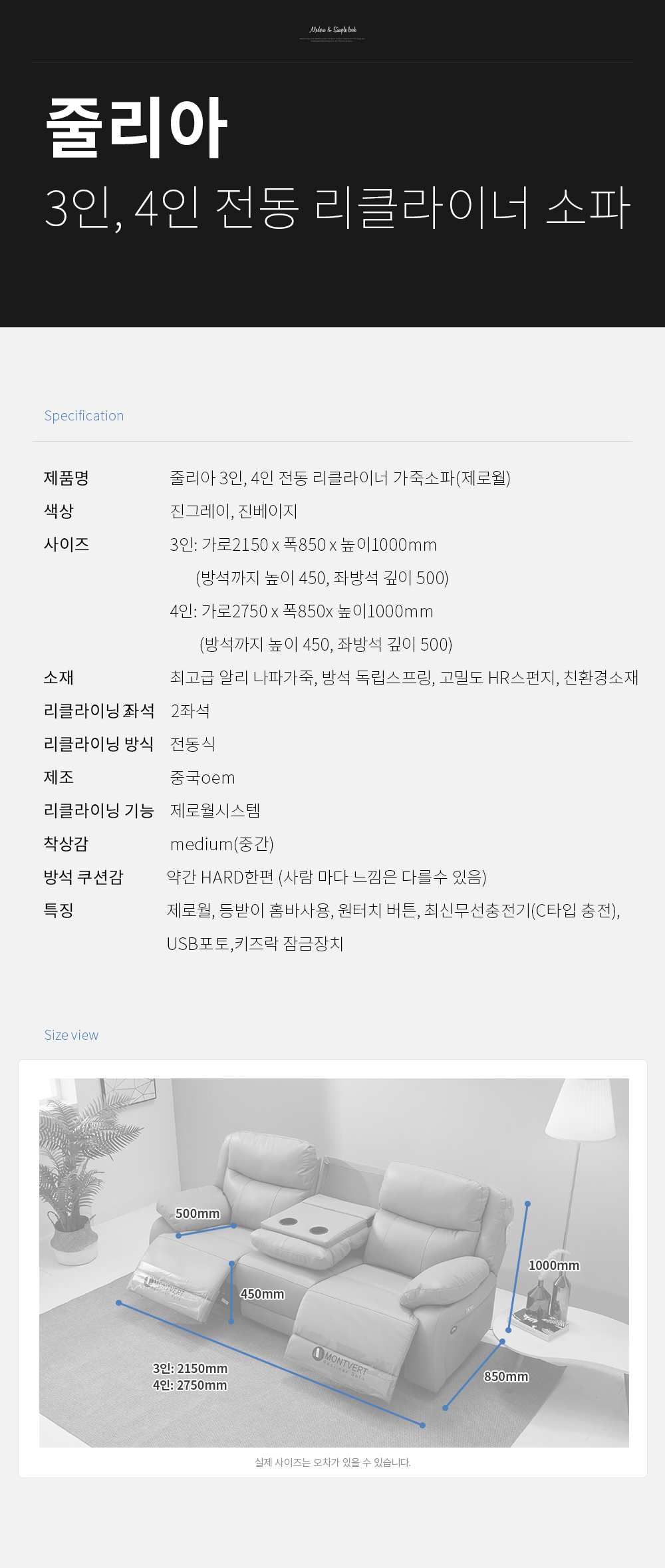 줄리아 3인, 4인 전동 리클라이너 가죽소파(제로월)